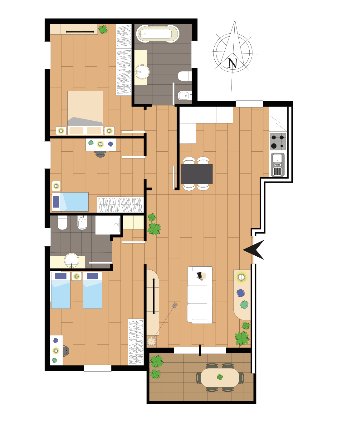 Un disimpegno ben strutturato accompagna alla zona notte, dove si sviluppano tre camere da letto di diversa metratura, tutte facilmente arredabili e adatte a soddisfare varie esigenze abitative: dalla camera matrimoniale spaziosa alle camere singole perfette come stanze per bambini, studio o ospiti. I due bagni, entrambi finestrati e rifiniti con materiali di qualità, offrono uno dotato di vasca per momenti di relax e l’altro con una comoda doccia moderna.